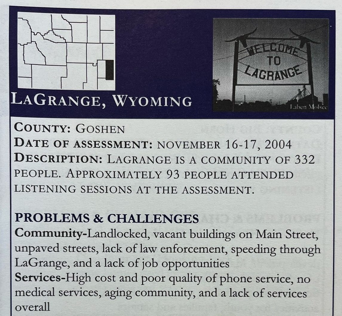 LaGrange, Wyoming, is a thriving Western community, with tremendous potential for new business development. A healthy mix of long-standing businesses and budding entrepreneurs prosper in this small town. The Town of LaGrange promotes a positive business climate and is continually working toward enhancing the community for current and future residents. Evidence of this planning is seen in the Community Assessment Report by the Wyoming Rural Development Council.