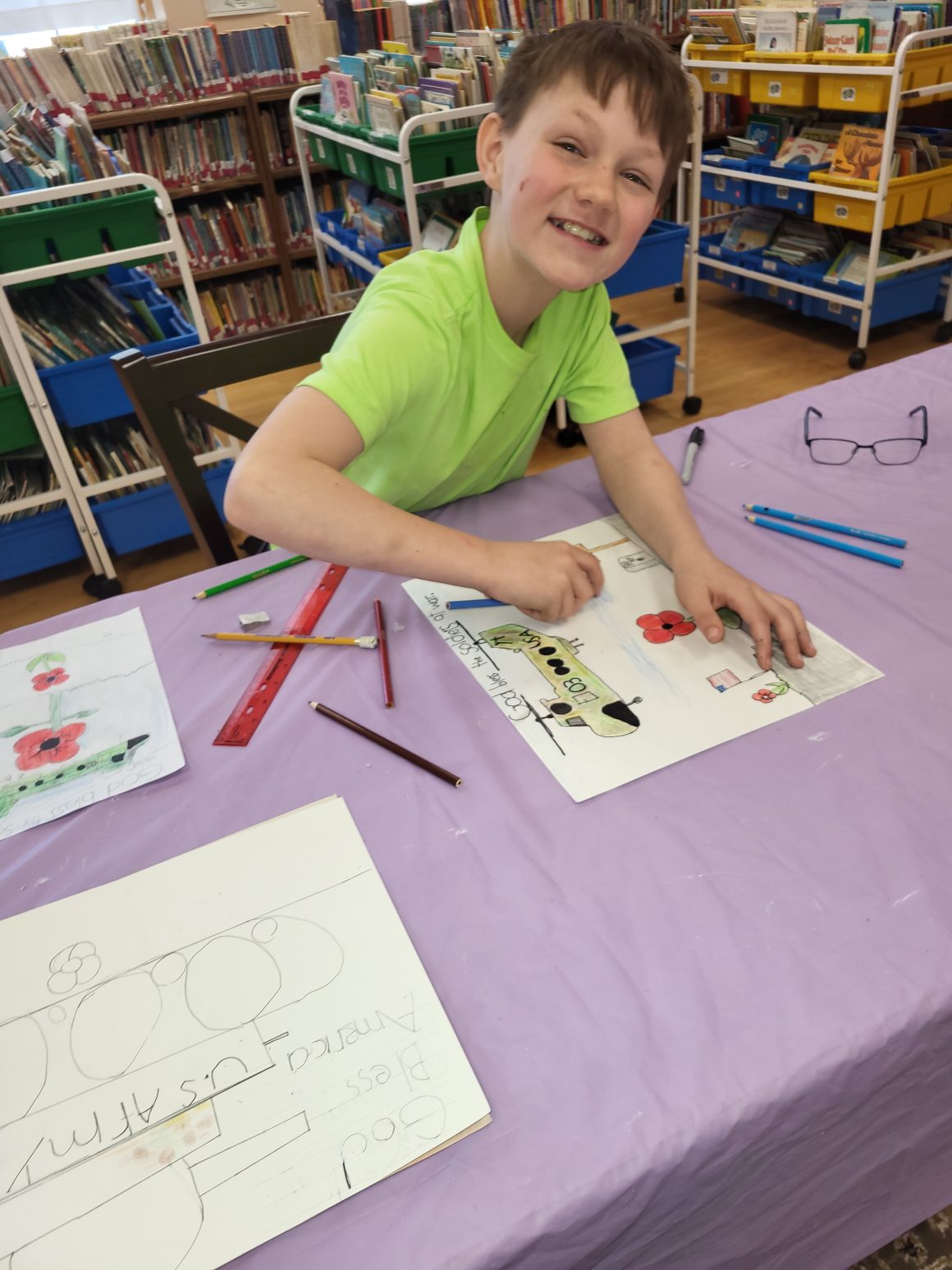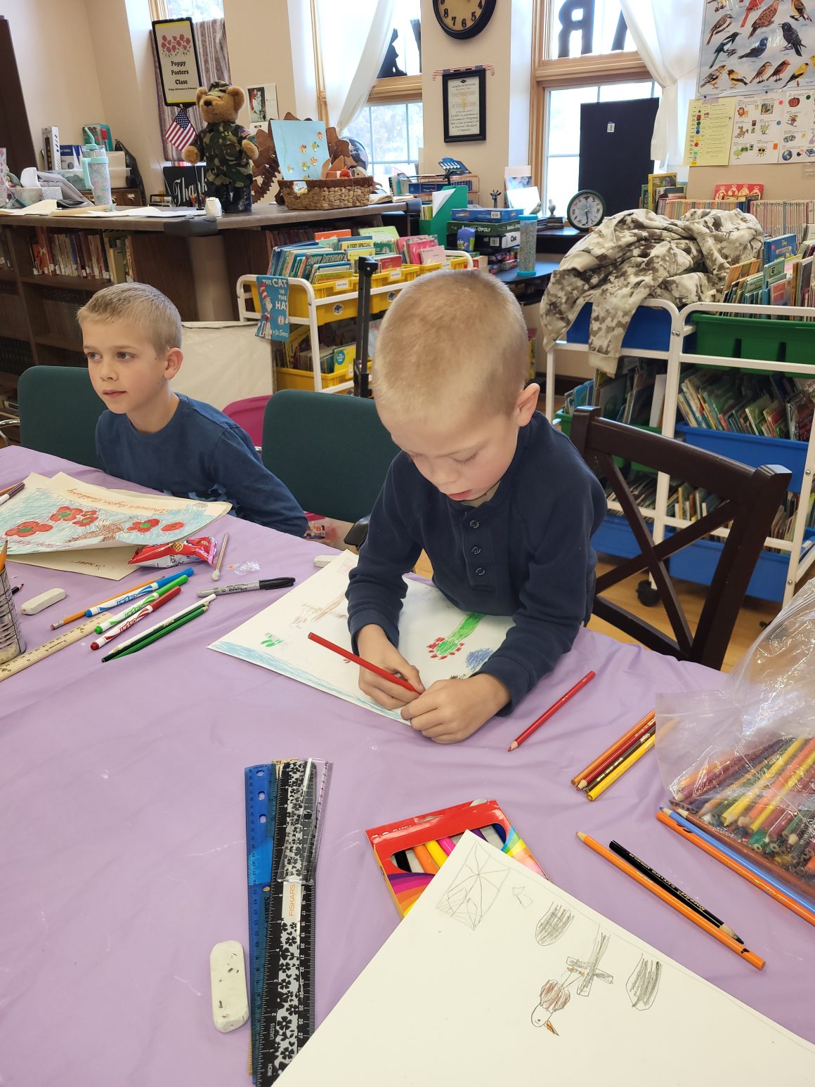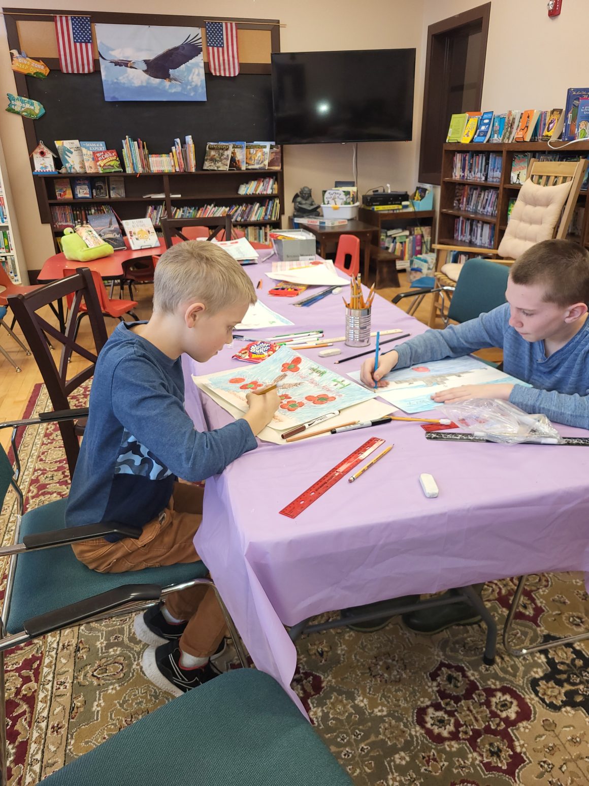 John A McGill American Legion Auxiliary Unit 70 in LaGrange encourages patriotism and Americanism through the Poppy Program. This program encourages everyone to wear a poppy in remembrance of America’s military Veterans. To help spread awareness, students are invited to participate in the Poppy Poster Program. Students attend classes (usually after school) to learn about the significance of the poppy and how to design a poster which advertises the importance of the red crepe paper flower. Participants learn art and advertising techniques and messaging along with American history and respecting those who died defending our country.